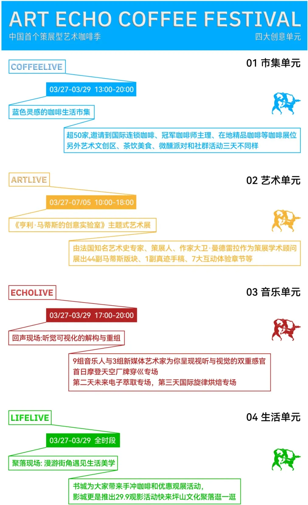[💛黄色-艺术单元; 💙蓝色-市集单元,❤红色-音乐单元]