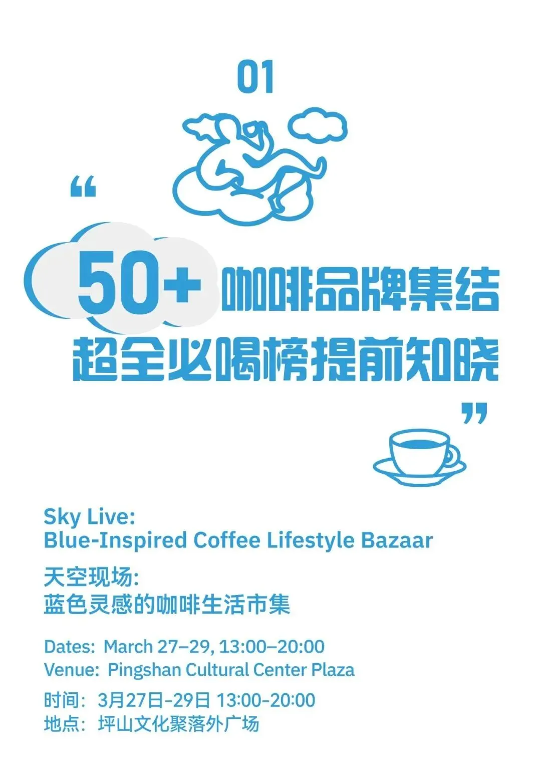 作为坪山首个大型咖啡主题市集,本次市集以蓝色灵感为主线,集结星巴克、皮爷咖啡、麦咖啡、X CAFE、抬头咖啡、岛屿乐园等 50 余家精品咖啡、艺术文创、茶饮美食品牌。