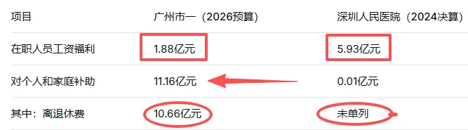 广州的“对个人和家庭补助”金额很高,其中离退休费占了10.66亿元的大头。这说明广州医院在退休人员保障方面的支出比例更高。