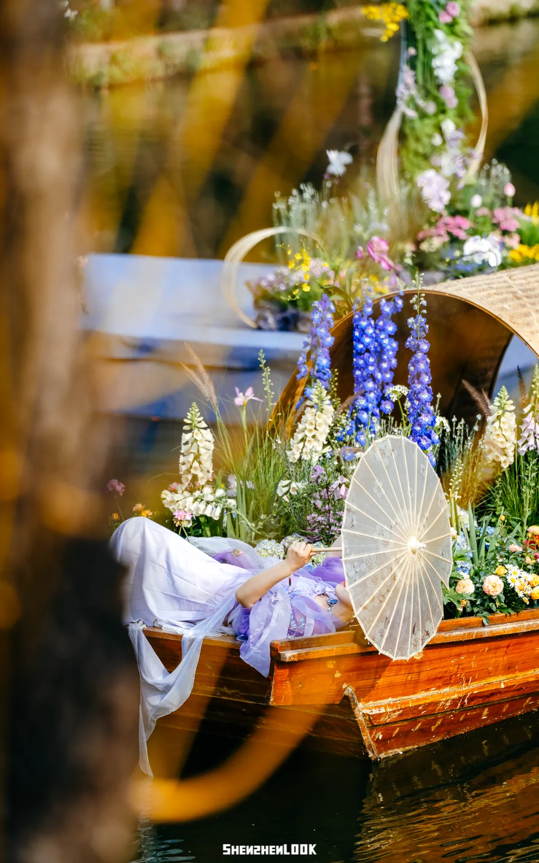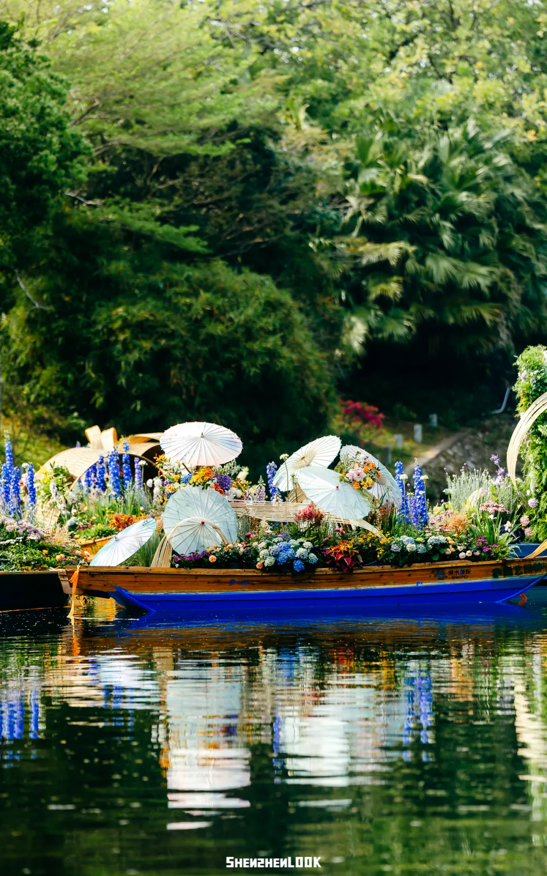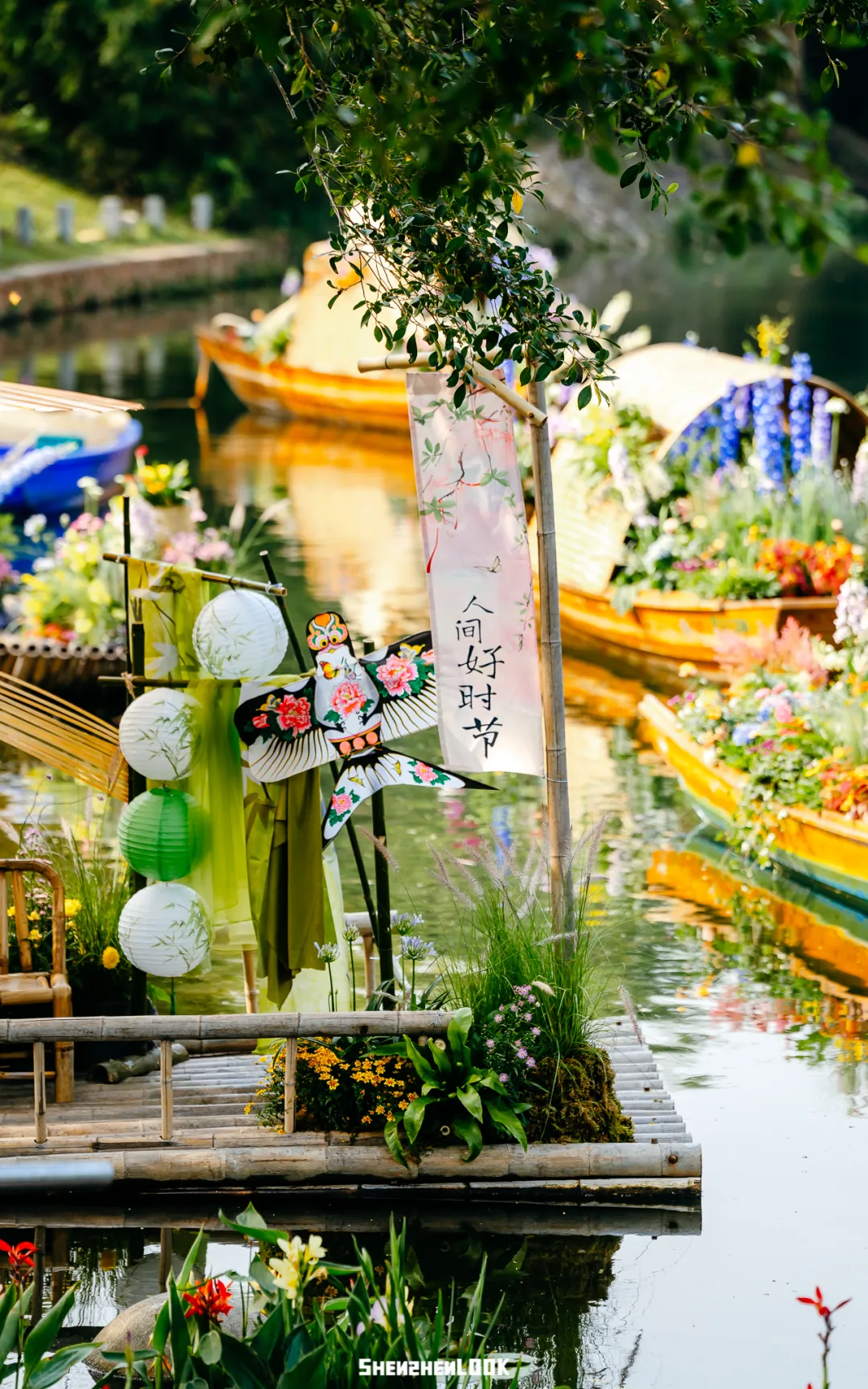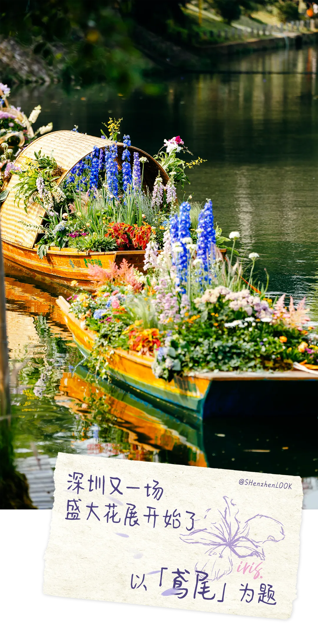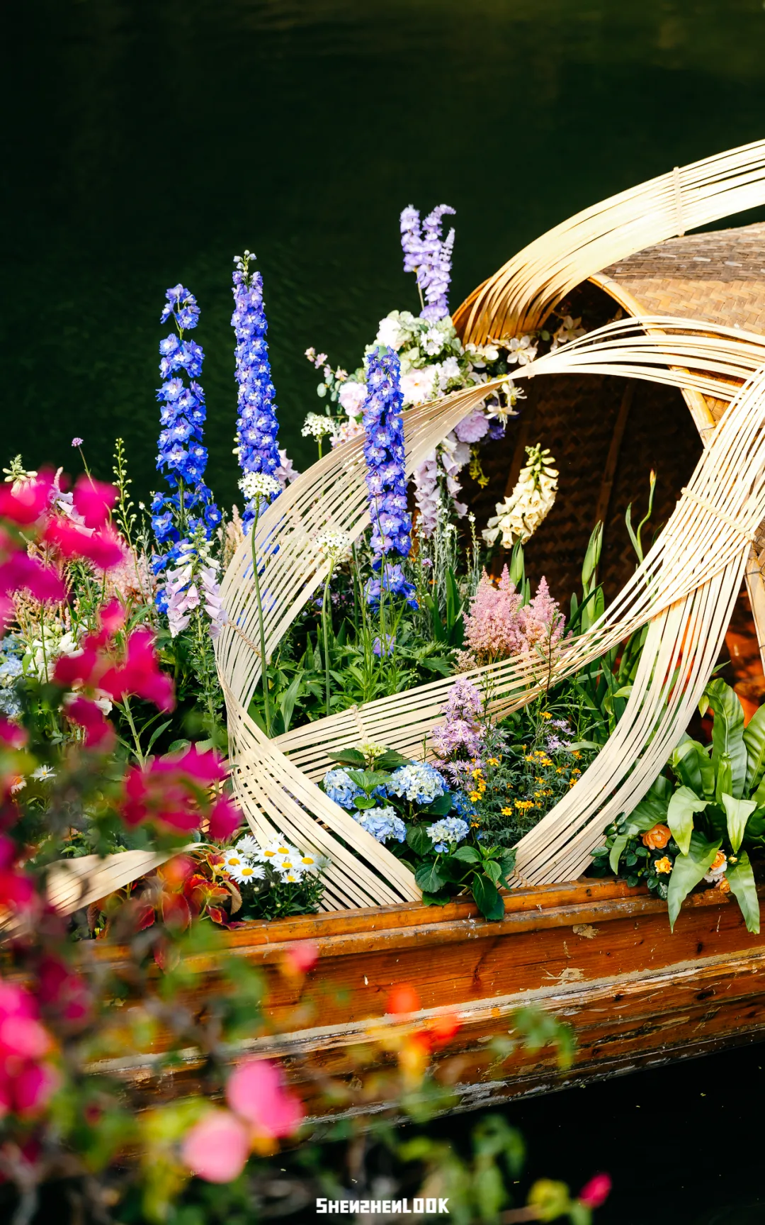 整个花展里,最喜欢的一处打卡点便是福田河上的“小小花海”。木舟化身花园,绣球、高翠雀花、毛地黄……在木舟上绽放,河面倒映出着木舟花园的影子,缤纷的花色在河面绘成一幅油画。