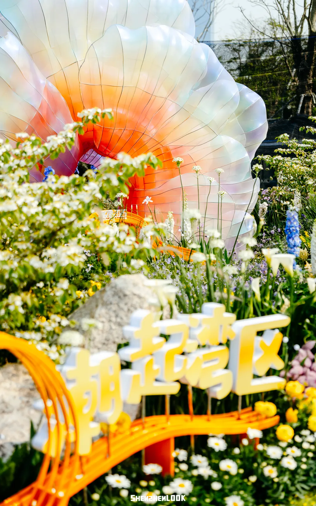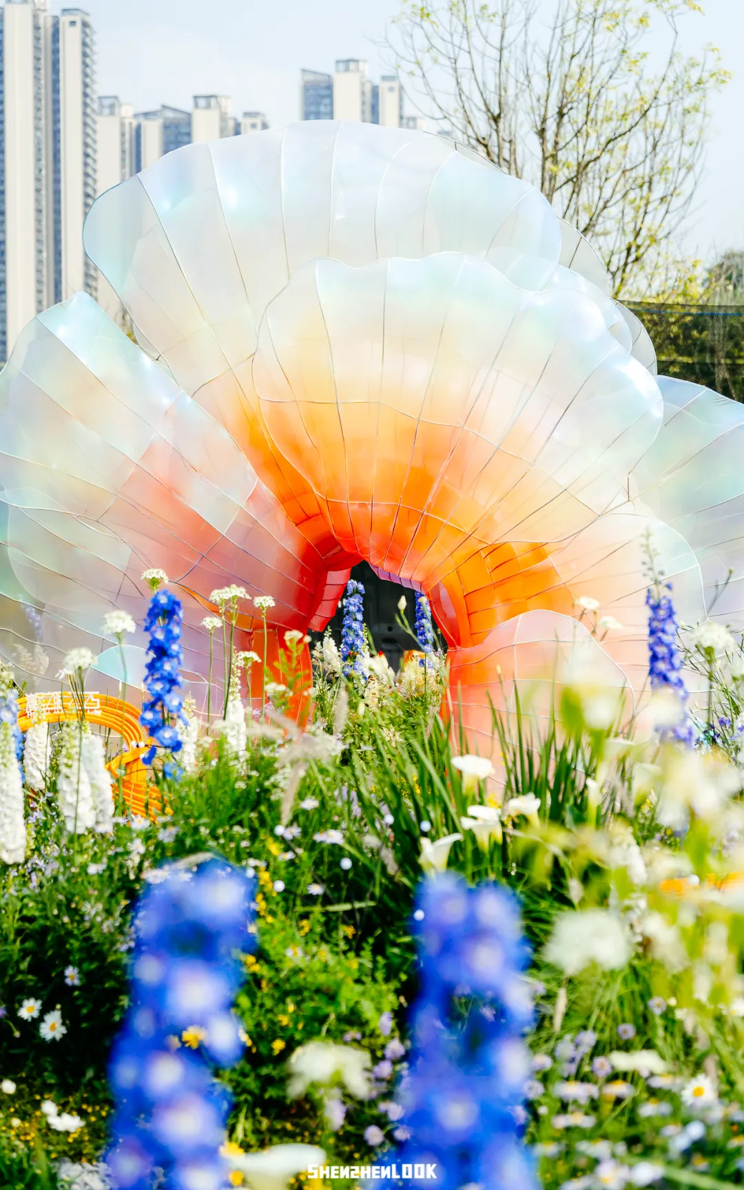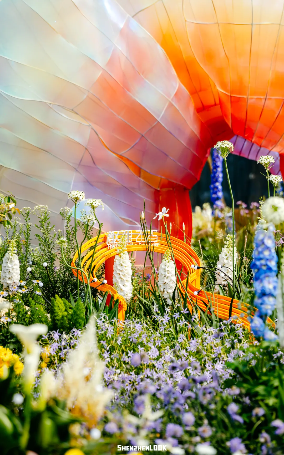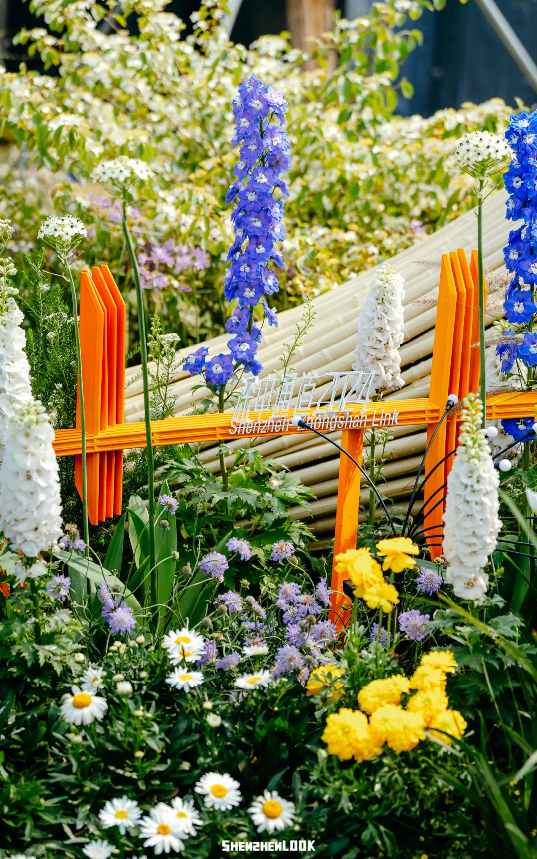 「潮起湾区」的花园里,高翠雀花、马蹄莲、雏菊等花卉盛开,皆是清新淡雅的颜色。巨型花朵装置坐落其中,橙色装置如绸带般蜿蜒穿梭在花丛间,标志着深中通道、湾区之眼等属于湾区的大事件。