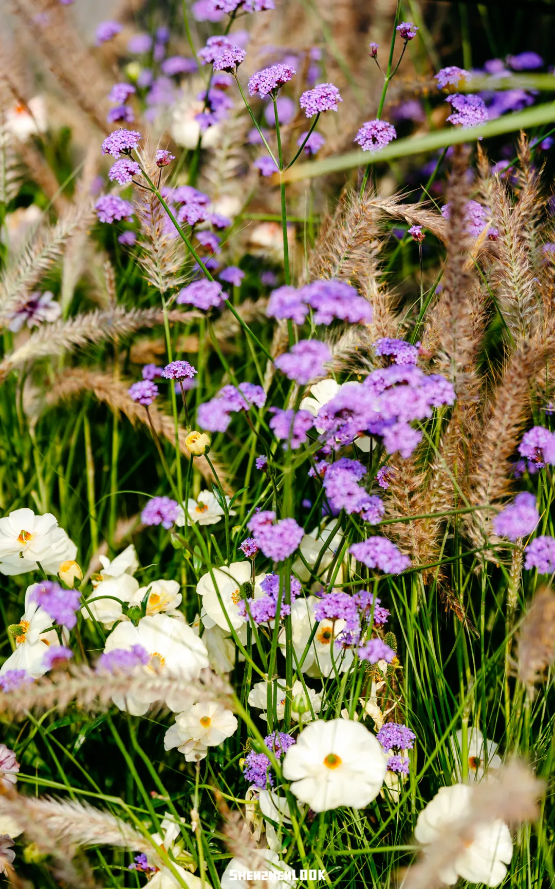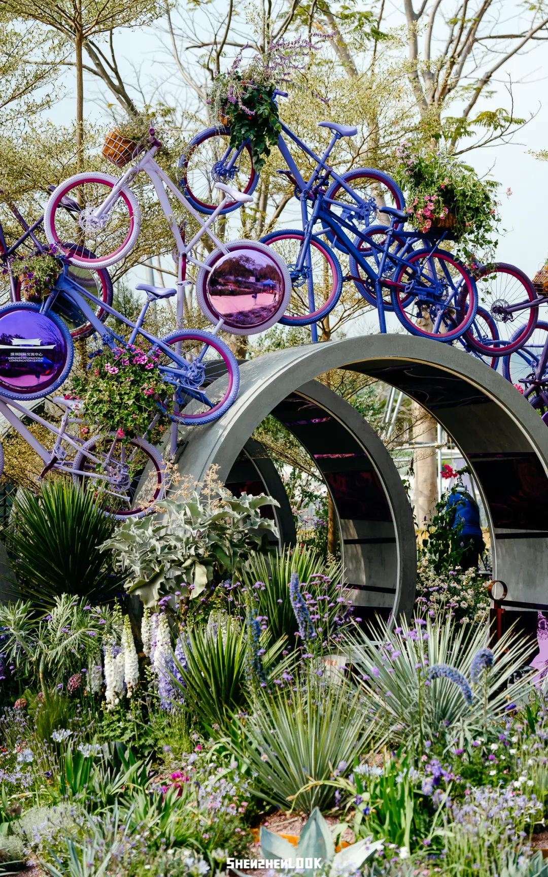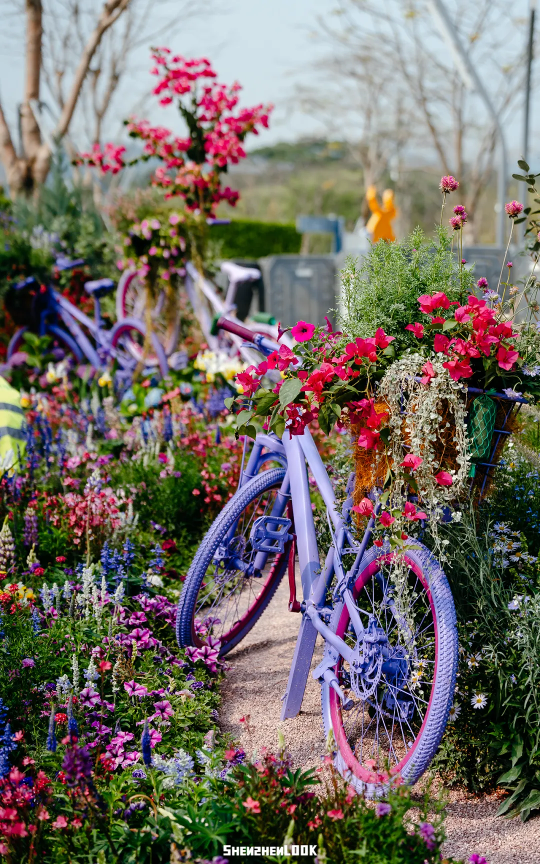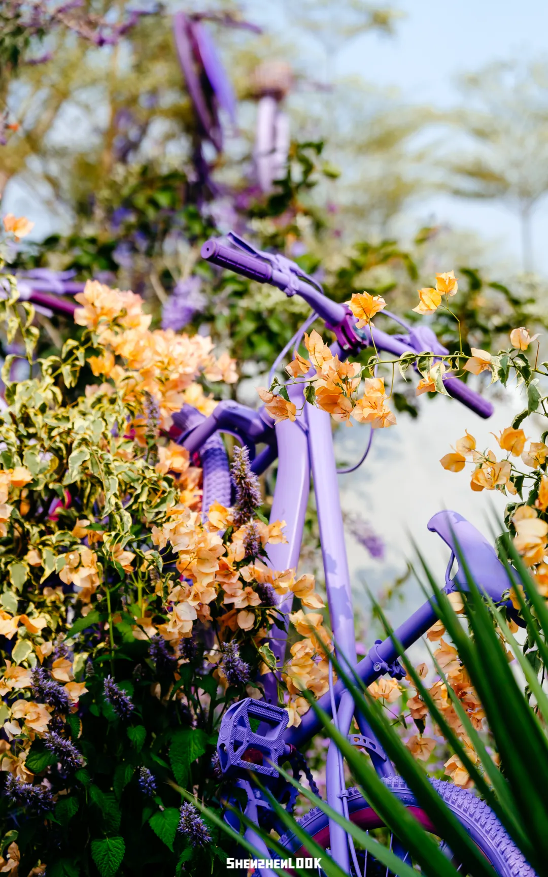 自行花园以“自行车”为主题,以各色三角梅、白芒草、飞燕草搭配。一辆辆紫色自行车停靠在花径中、花架旁,像是骑着车穿梭花海间,随意停靠下车赏花,打造了一处轻松自在的场景。