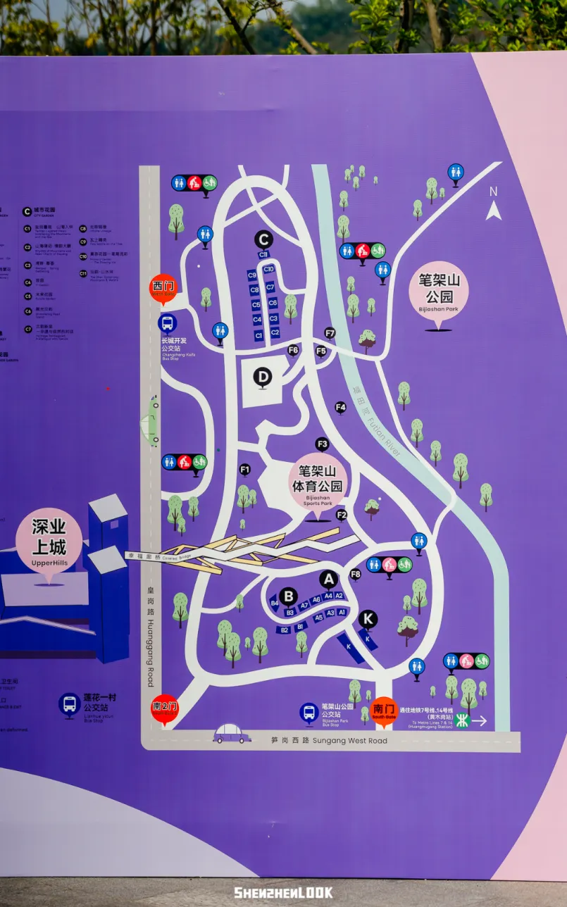 从笔架山体育公园南门进→主题花花园→大师园→湾区花园→迷你花园→福田河→城市花园→鲜花市集→幸福廊桥(往深业上城)