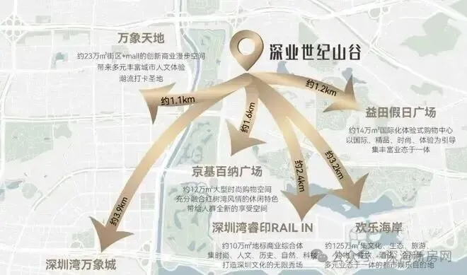 - 配套极度成熟:3公里范围内汇聚万象天地、益田假日广场、欢乐海岸等六大高端商圈;医疗方面靠近三甲医院(协和深圳医院)。