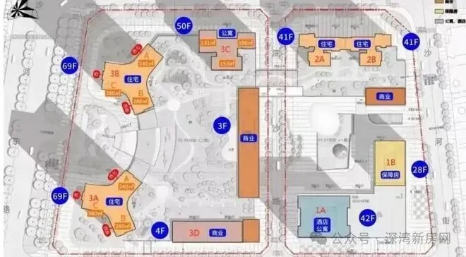 总栋数:8栋(1A栋42层酒店+公寓、1B栋28层保障房,2栋1/2单元41层住宅,3A/3B栋69层住宅;3C栋50层公寓、3D栋4层公寓)