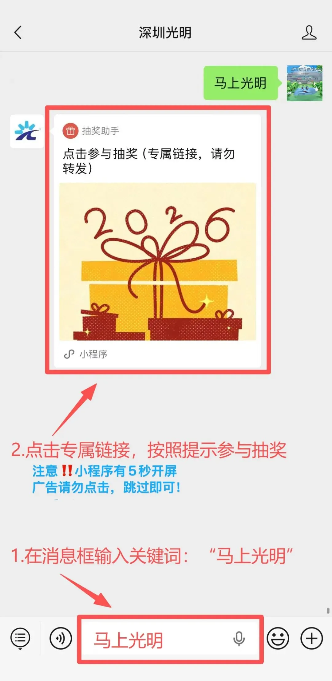 3.在公众号后台回复关键词“马上光明”可获取抽奖链接,按照提示上传“点赞+推荐”截图即可参与抽奖。