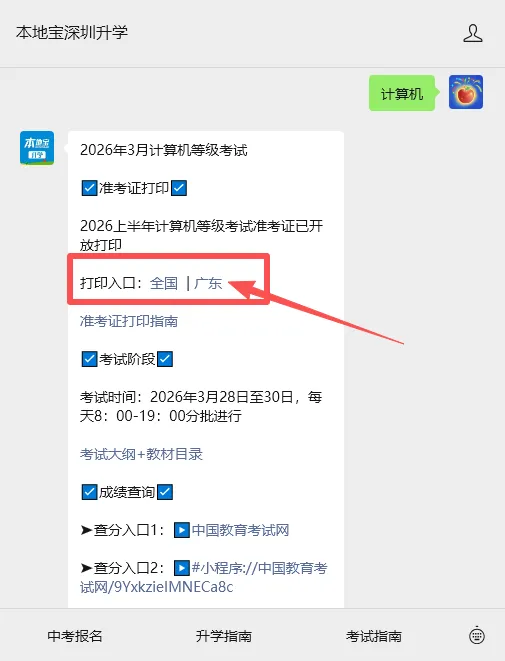 或扫描下方二维码,关注【本地宝深圳升学】回复【计算机】获取深圳计算机等级考试准考证打印入口