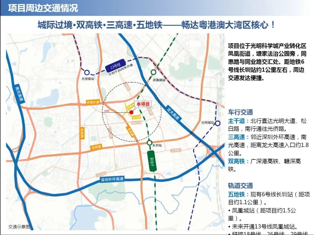 项目位于光明科学城产业转化区凤凰街道,塘家法治公园旁,同惠路与同业路交汇处。距地铁6号线长圳站约1公里左右,周边交通发达便捷。