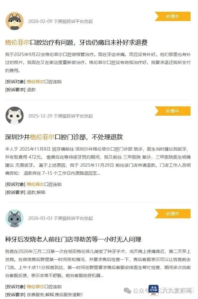 在“3·15国际消费者权益日”即将到来之际,南都记者整理黑猫投诉平台深圳地区医疗美容及口腔医疗消费领域2025年以来的投诉数据后发现,这两大热门消费领域的相关投诉中,美莱医疗美容医院、艺星医疗美容医院、米兰柏羽医疗美容医院、鹏爱医疗美容医院等医美连锁品牌的投诉量位居前列;口腔医疗机构的投诉则主要集中在格伦菲尔口腔、同步齿科等大型连锁机构。2025年至今,涉及这6个品牌机构的投诉累计达112起,涉诉总金额超过1600万元。从投诉详情来看,消费者反映的核心问题主要集中在手术失败、退款困难、虚假宣传等几大类别。01|口腔医疗机构:门店“跑路”退款无门 服务与专业双重失守2025年1月至今,消费者通过黑猫投诉平台对深圳格伦菲尔口腔和同步齿科的投诉共计24起,其中格伦菲尔口腔19起,同步齿科5起。投诉涉及的问题包括医生专业能力不足、虚假宣传、退款受阻、服务敷衍,甚至出现门店“跑路”等情况,涉及金额从几十元到上万元不等,累计涉诉金额超过200万元。