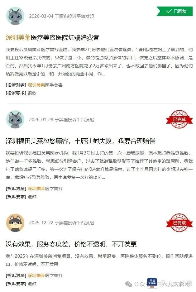 02|医美机构:医美事故投诉最多 其次为虚假宣传、诱导消费记者统计发现,2025年1月至今,黑猫投诉平台上关于深圳美莱、艺星、米兰柏羽、鹏爱四家医美机构的消费投诉共计88条,其中美莱和艺星各33条,米兰柏羽13条,鹏爱9条,累计涉诉金额超过1300万元,单起投诉最高涉诉金额达16万元。