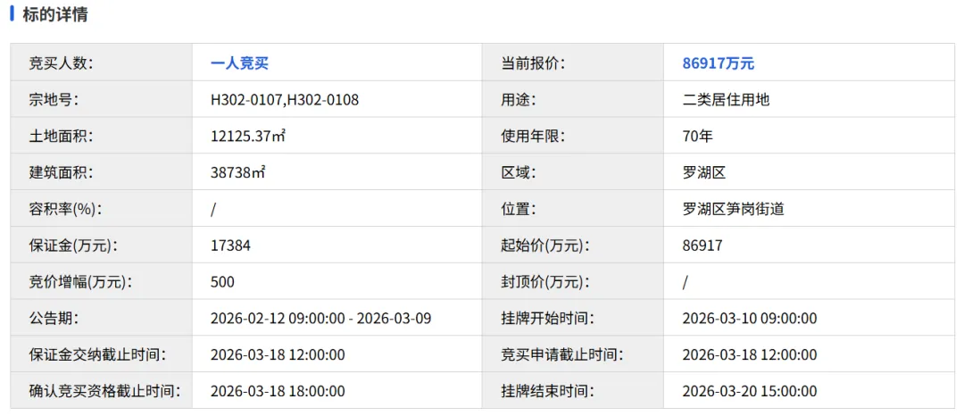 2月12日,深圳交易集团挂牌罗湖笋岗 H302-0107地块,起拍价8.7亿元,楼面地价约22437元/㎡,最终一人竞买,由深圳地铁集团底价竞得。