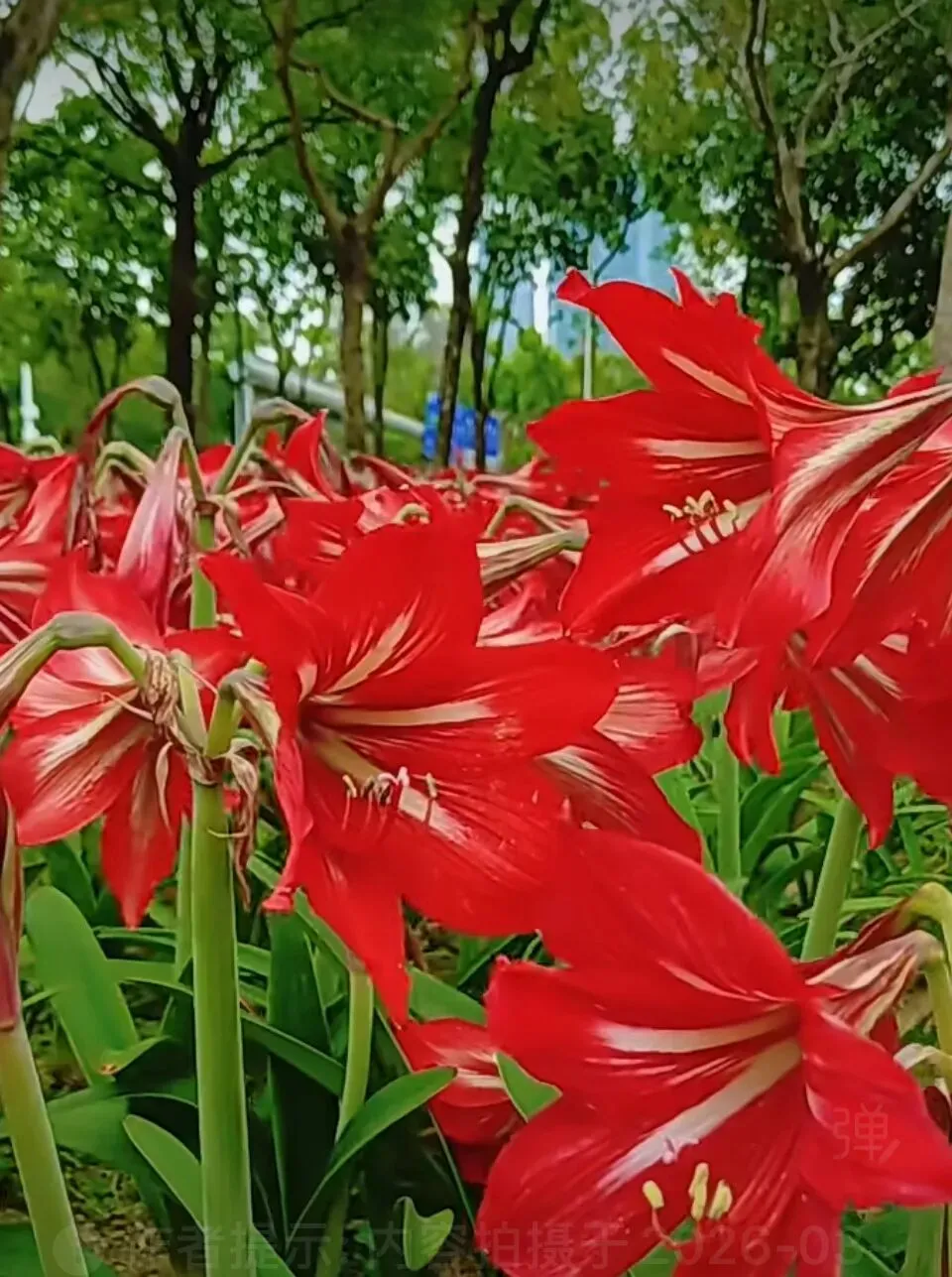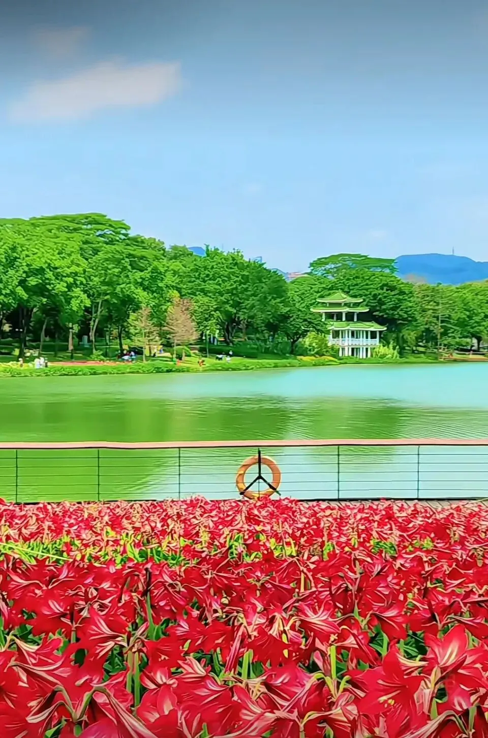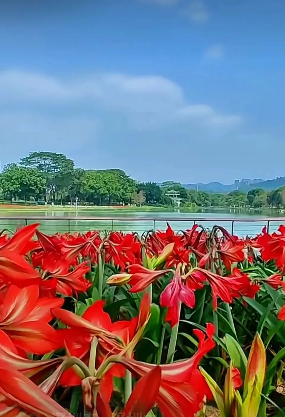 环湖的朱顶红正热烈盛放,火红花簇铺展成海,与碧水、绿树构成鲜明的色彩层次。