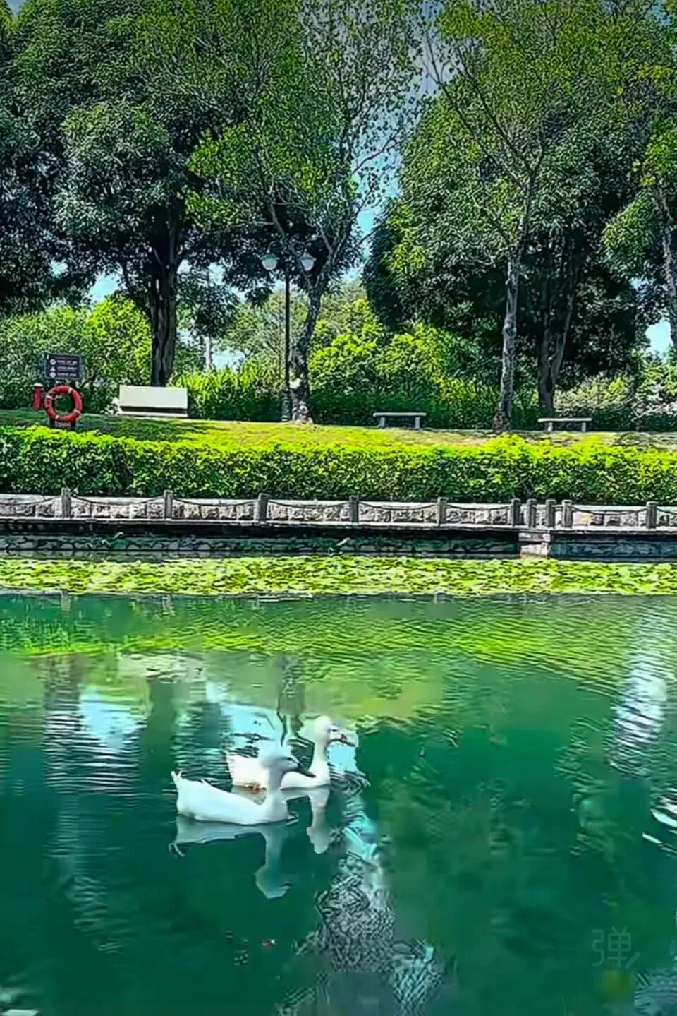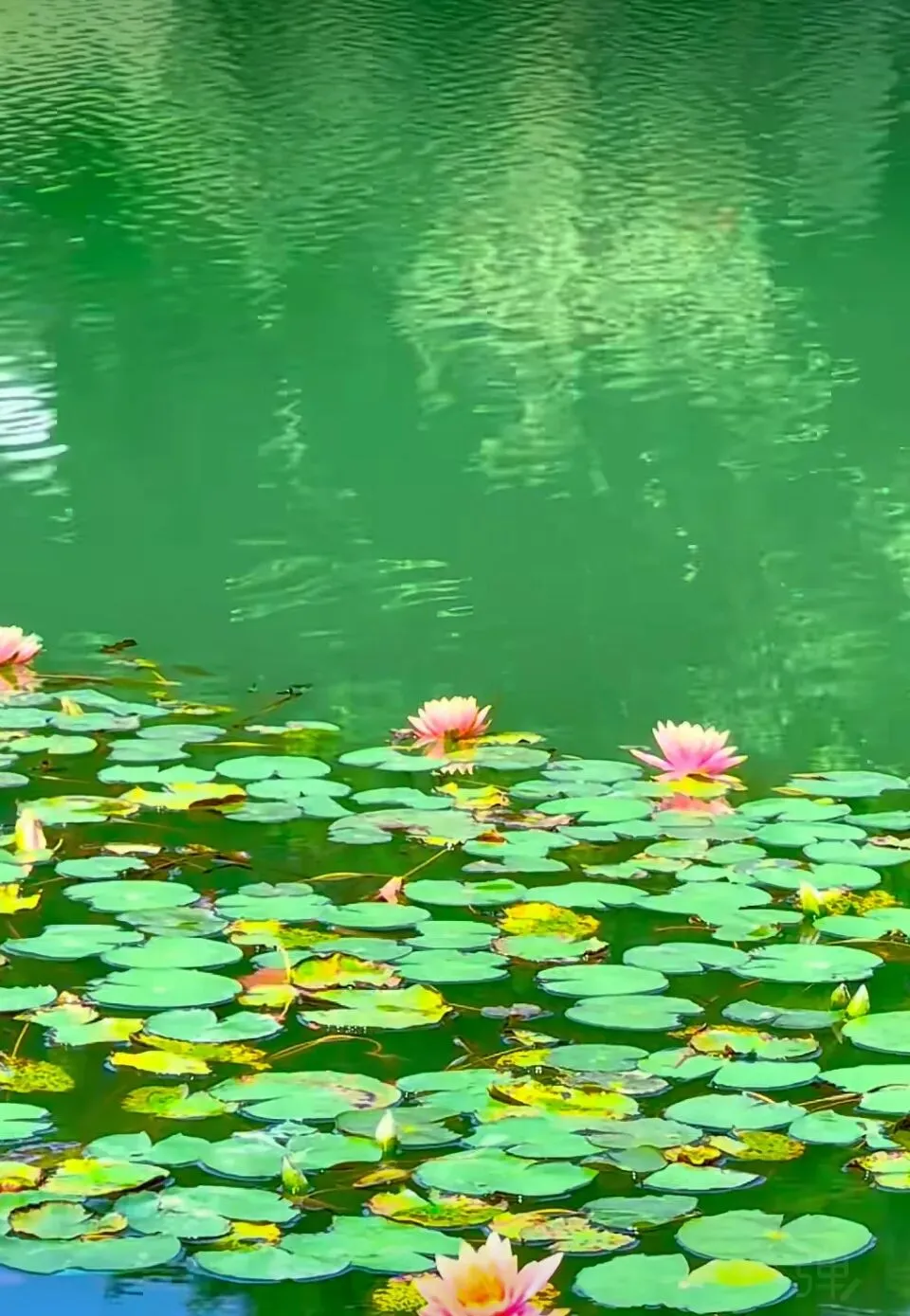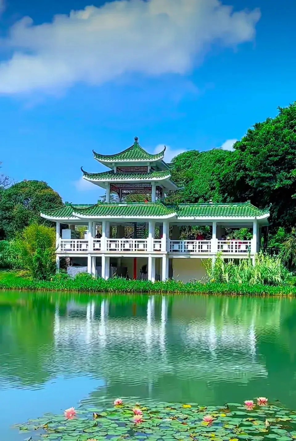 湖面睡莲轻摇粉瓣,与风雨轩的绿瓦白栏相映成趣,静谧温柔;