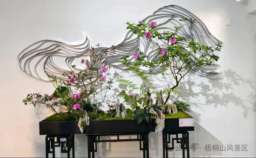 造型别致的杜鹃插花作品错落摆放,或清雅、或浓烈,每一件都尽显岭南花艺的独特韵味,成为梧桐山春日里的一抹文艺亮色,吸引了众多游客驻足观赏、打卡留念,在赏花之余感受非遗文化的魅力。