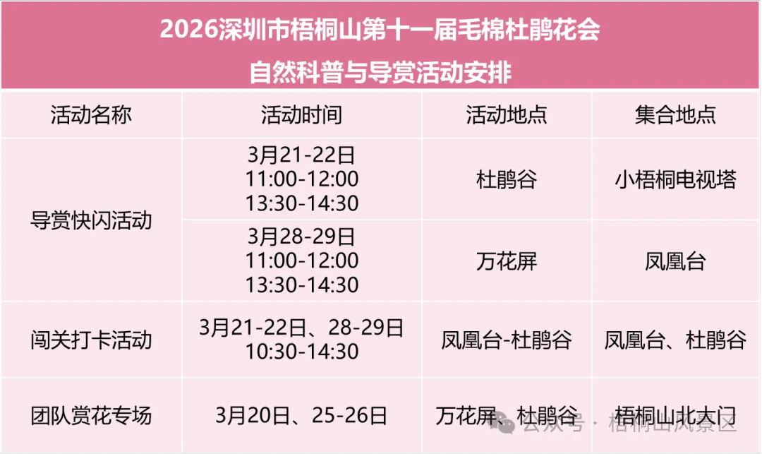 梧桐山自然学校在杜鹃谷、万花屏开展 “导赏快闪”“闯关打卡” 活动,还有 “团队赏花专场” 可预约,专业讲师带你解锁杜鹃科普知识,边玩边学感受自然之美。