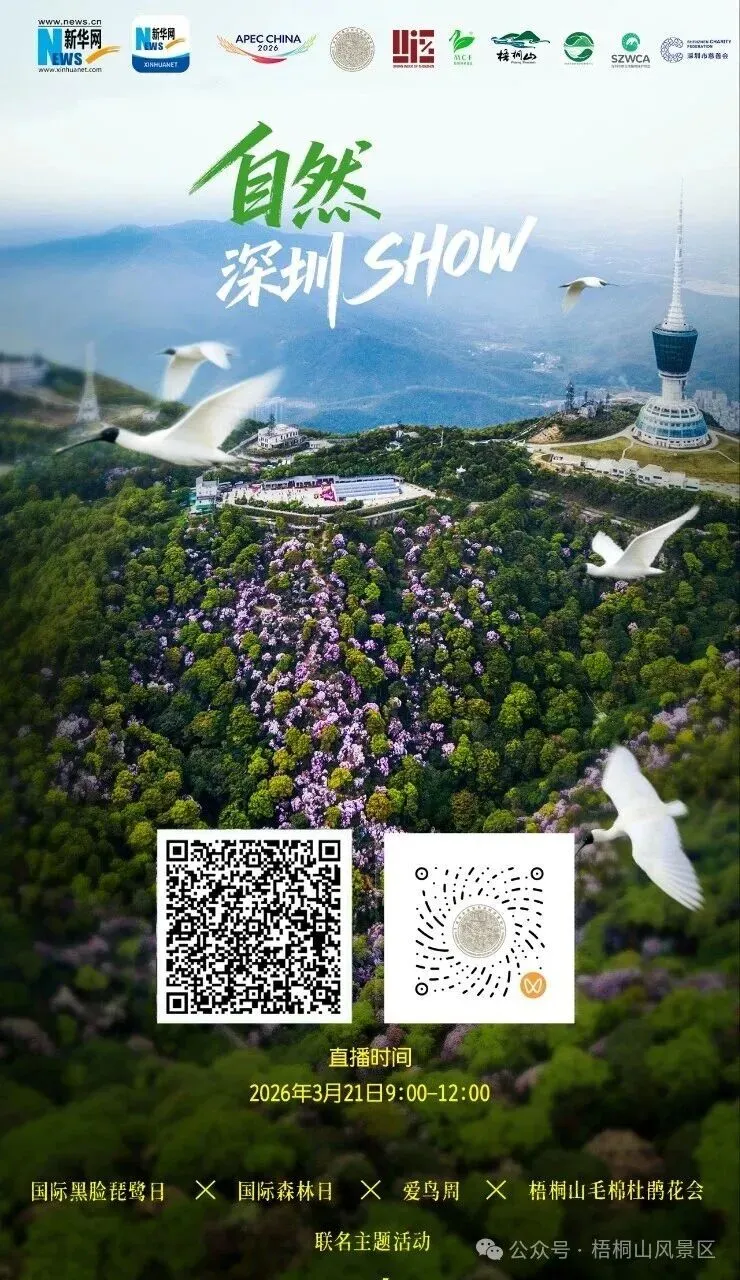 “自然深圳SHOW”主题系列活动将于3月21日开启!本次活动主题深度契合APEC愿景,首次融合自然资源主题日与品牌活动(国际黑脸琵鹭日X国际森林日x爱鸟周x梧桐山毛棉杜鹃花会),展现深圳自然资源保护和生态文明建设实践。请关注“深圳规划资源海洋”了解更多活动信息。