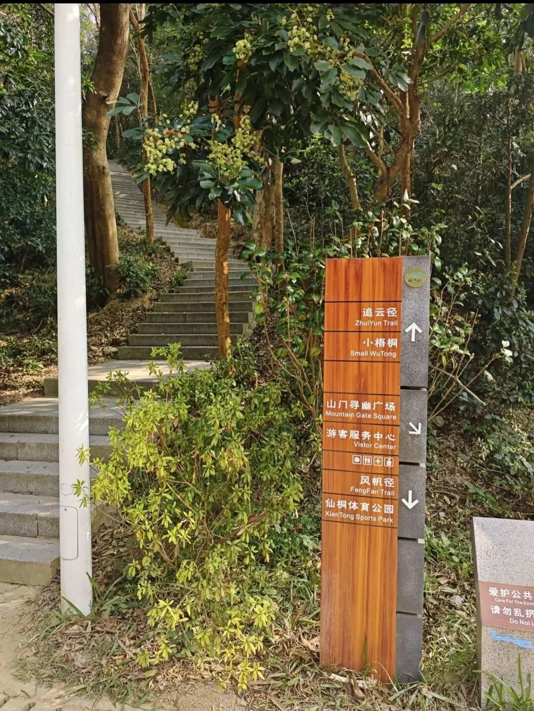 踏入山径,木色指示牌指向追云径、小梧桐,也指向城市之外的秘境——这里既是登山者的起点,也是自然与人文交汇的入口。