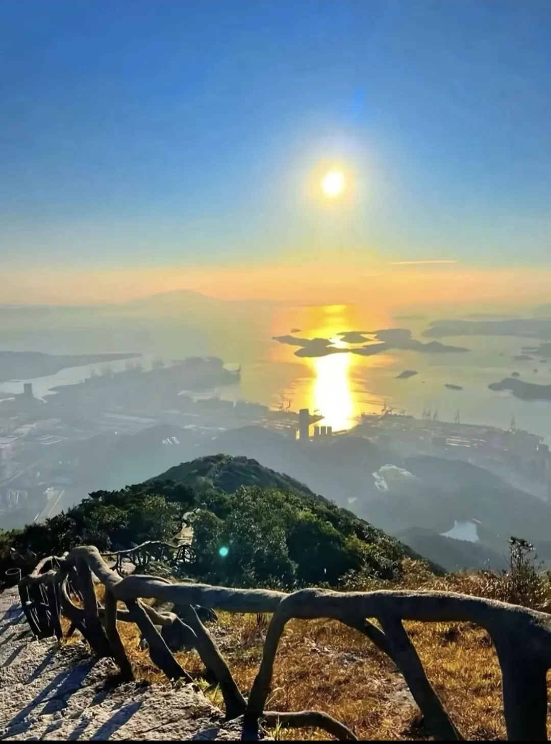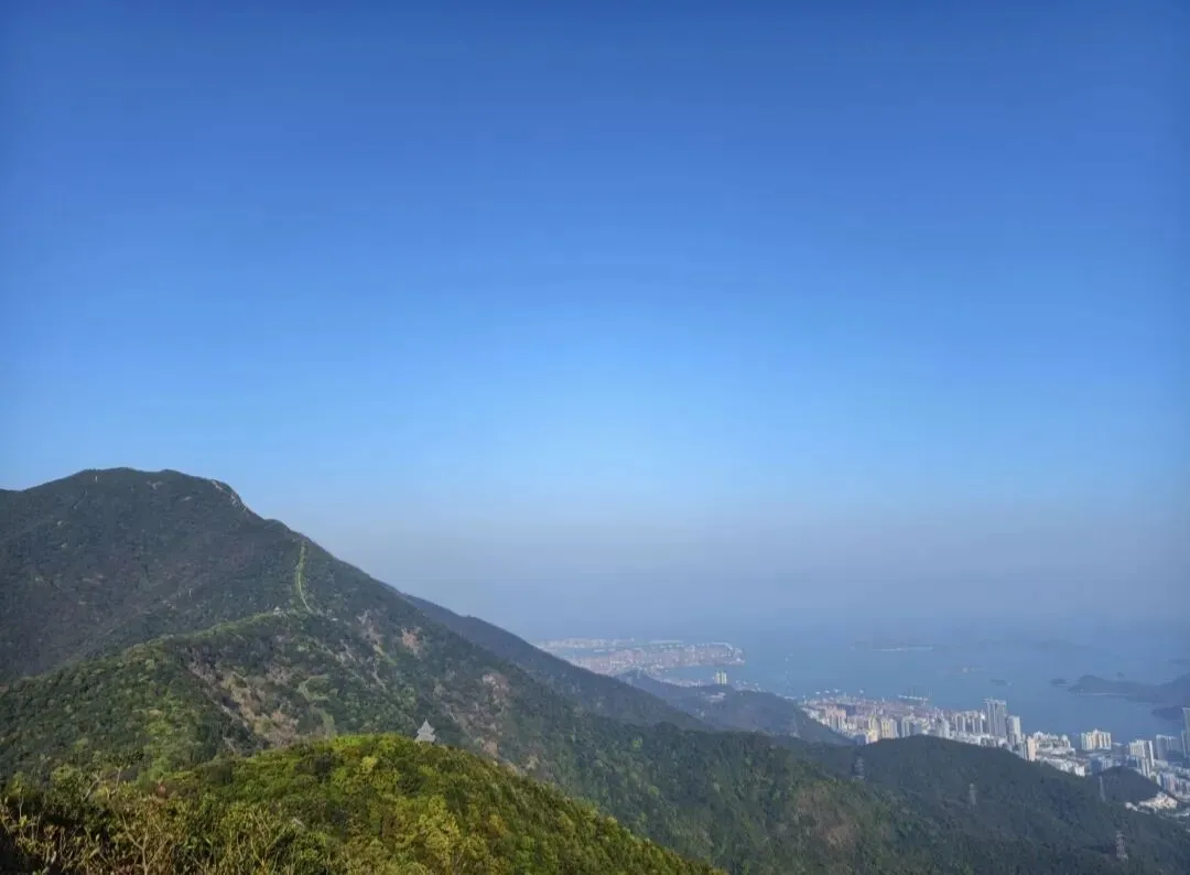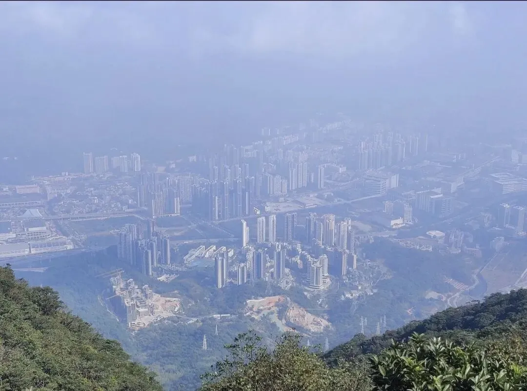 登顶的瞬间,视野豁然开朗。站在巨石嶙峋的山巅,城市与山海在脚下铺展成画:远处,深圳的高楼群在薄雾中若隐若现,海湾的岛屿如散落的翡翠,港口的吊机勾勒出工业与自然的奇妙共生;近处,山风掠过发梢,将城市的喧嚣揉碎在云海与绿意里。