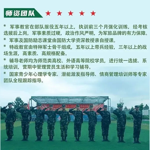 环境保障:入驻八一专属军事营区,军事氛围浓厚;训练活动场所设置明显安全提示并配有专职安全监督巡视员;军人24小时执勤巡逻;