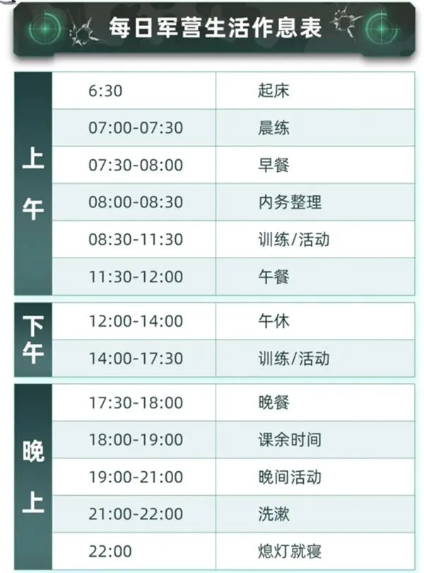 1、学员须严格遵守营地规章制度、纪律要求和作息时间,按时参加各项训练活动;