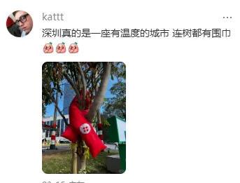 一张树身戴着围巾的照片则让一位网友感慨,深圳真是一座有温度的城市。