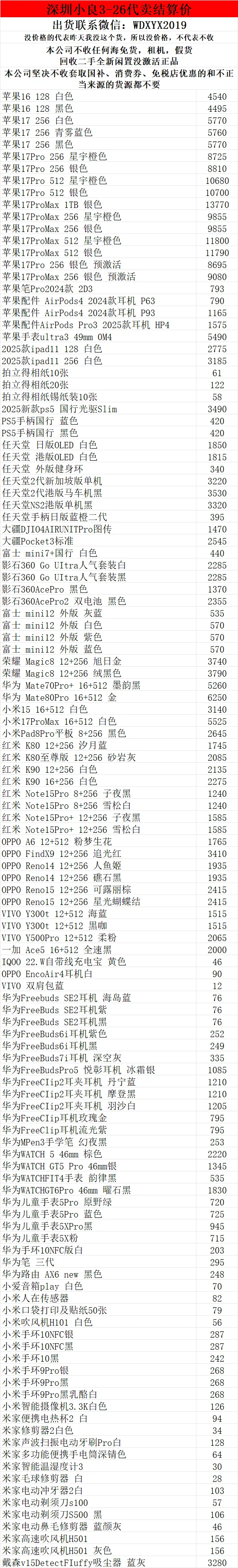 >深圳小良2026.3.26电子产品代卖结算价(美妆价格小程序查看)