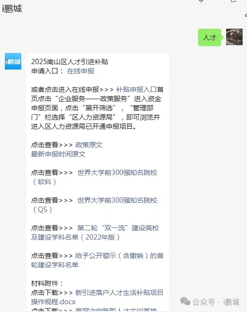 推荐方式:点击下方名片, 跳转到【i鹏城】公众号,在对话框回复【人才】即可获得申请入口,详细的申请流程,以及申请条件!