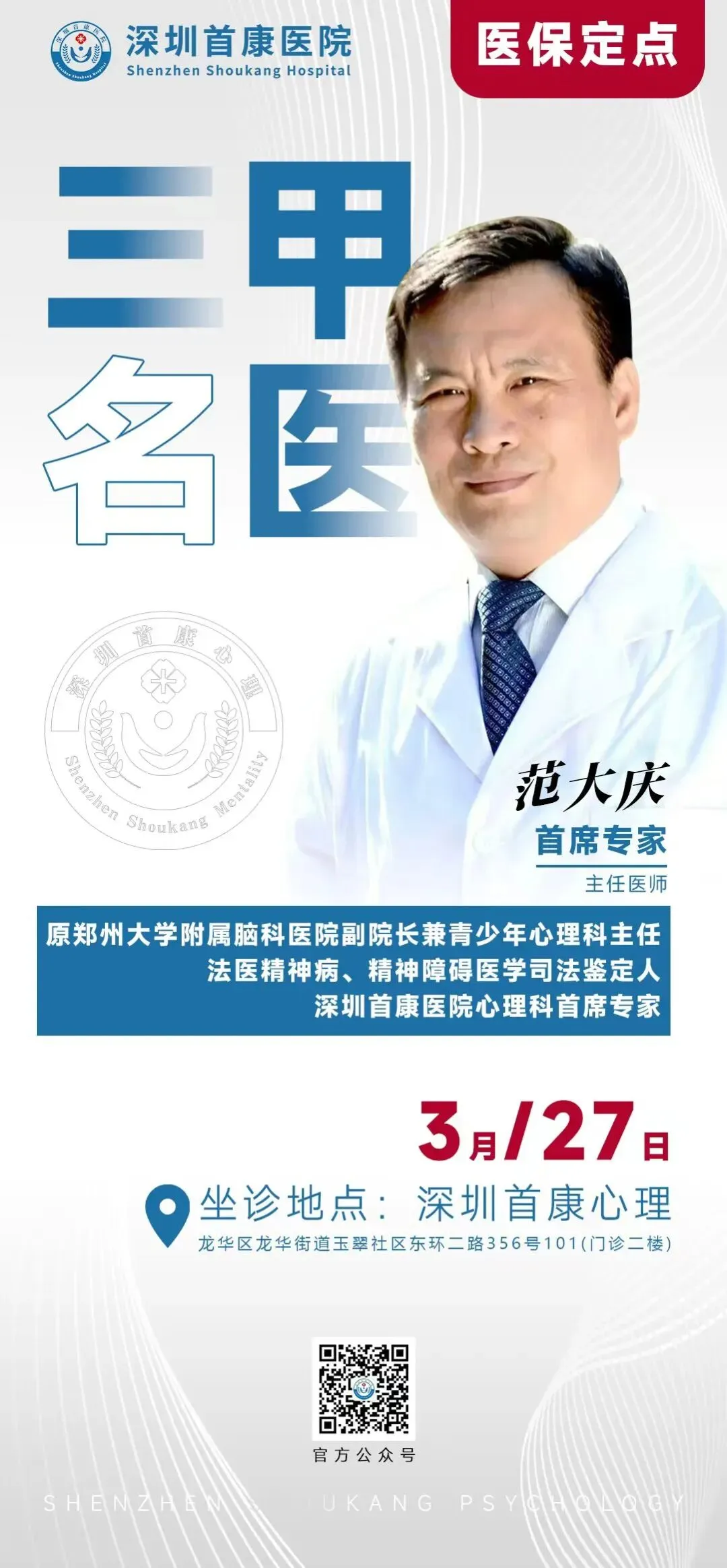 >深圳首康心理科3月27日原郑州大学附属脑科医院副院长范大庆首席专家和中山大学附属第七医院精神心理科新锐医生陈淑宝博士出诊