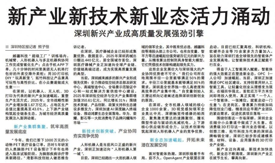 在深圳,以机器人、无人机、3D打印为代表的新兴产业加速崛起,重塑生产生活方式。2025年,全市战略性新兴产业增加值1.67万亿元,占地区生产总值比重提高至43.0%,上下游产业链构筑起全链条生态,为城市经济高质量发展注入澎湃动能。