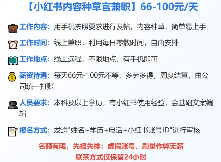 【深圳兼职】每日100元!前程无忧招募小红书种草官,利用每日零散时间发文即可,工资周结!会玩小红书就能做.