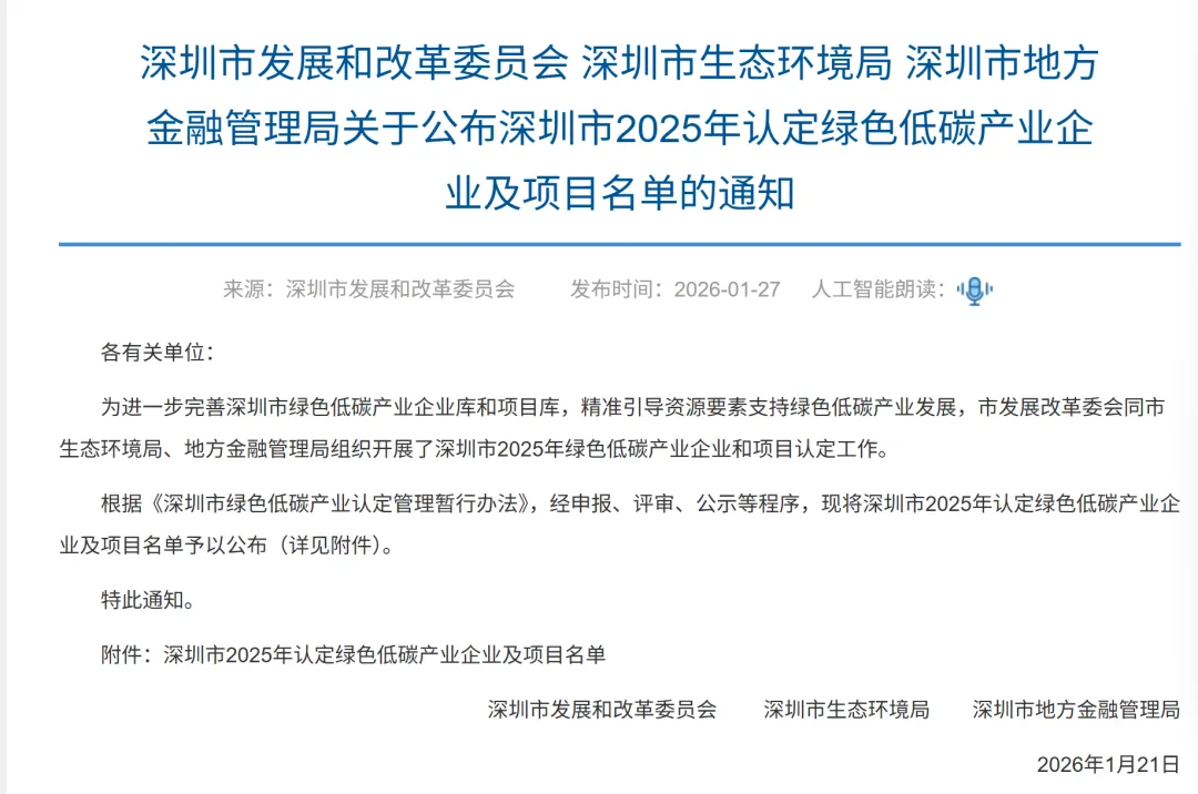 >深圳市三部门联合公布2025年绿色低碳产业项目名单,森若两项目入选