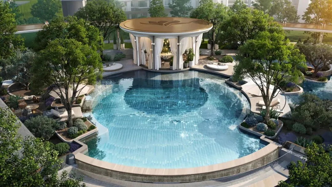 以圣特罗佩四季酒店浮岛泳池为蓝本,取蒙德里安《海堤与海》的线条与光影,于约560㎡无界水面上,解构光与水的诗意。区别于常规方形泳池,圆润的曲线不仅带来更浓烈的度假感,更让水循环更高效、水质更清澈。无锐角设计,孩子玩耍也更安心。炎炎夏日,不必远赴地中海。