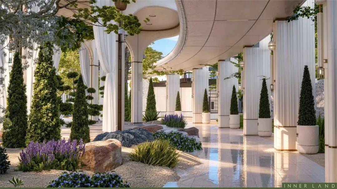 约75米风雨连廊,让业主回家不必淋雨或暴晒,两侧搭配错落有致的南法树种。每一棵树、每一个摆放位置,都经过反复推敲——不惜成本与心血。廊下是无边界社交场,廊外是南法花园。