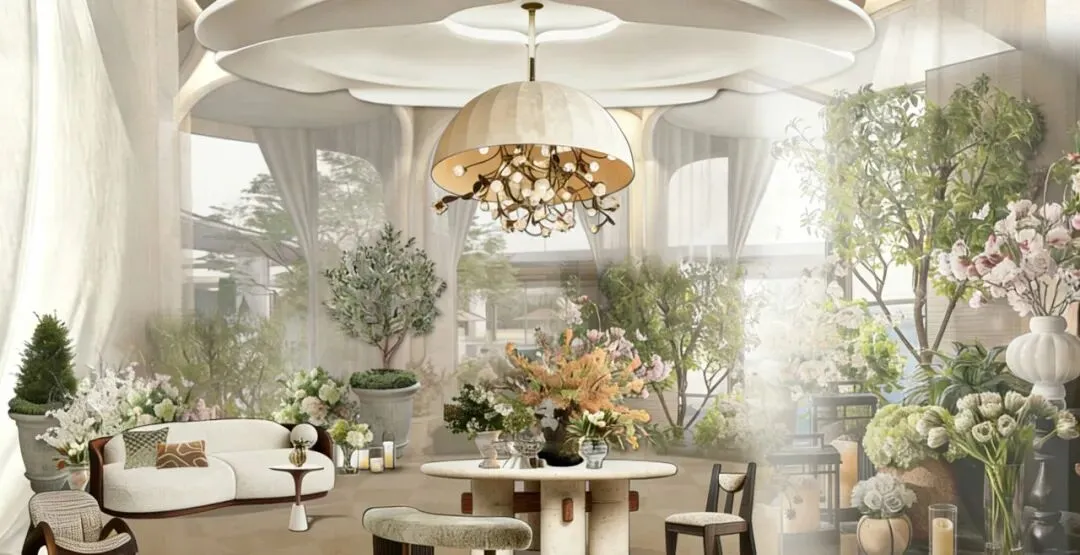 灵感源自法国尼斯老城与花市肌理,以轻盈纱幔与拱廊,模糊室内外边界。约4.8米奢阔挑高,通透敞亮。散步累了,随时坐下休息;邀闺蜜小聚,喝上一杯咖啡,心情自然愉悦。阳光洒落,手工插花,仿佛置身南法小镇的花房沙龙。