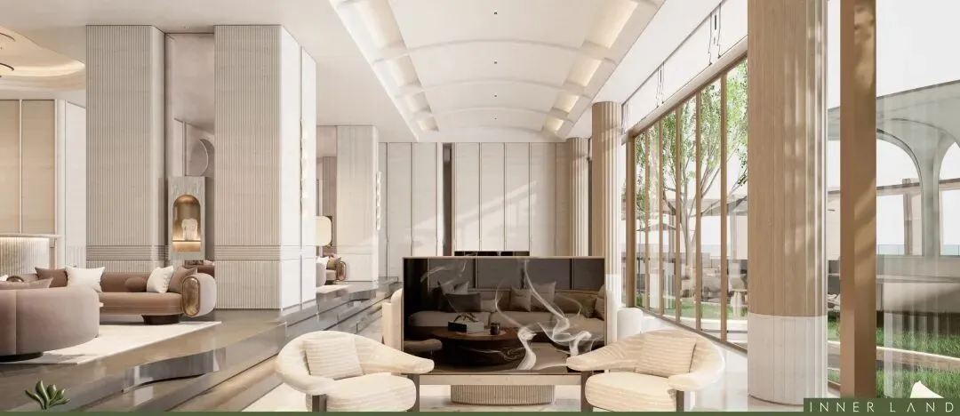 以玉兰花为设计元素,按顶奢酒店会客标准打造。局部层高约4m,搭配全景落地窗,南法园林尽收眼底。未来,可在此接待亲友、洽谈商务,无需预约酒店或茶室。很多沟通与合作,在这样的环境下水到渠成。这里是客厅,更是圈层的默契场。