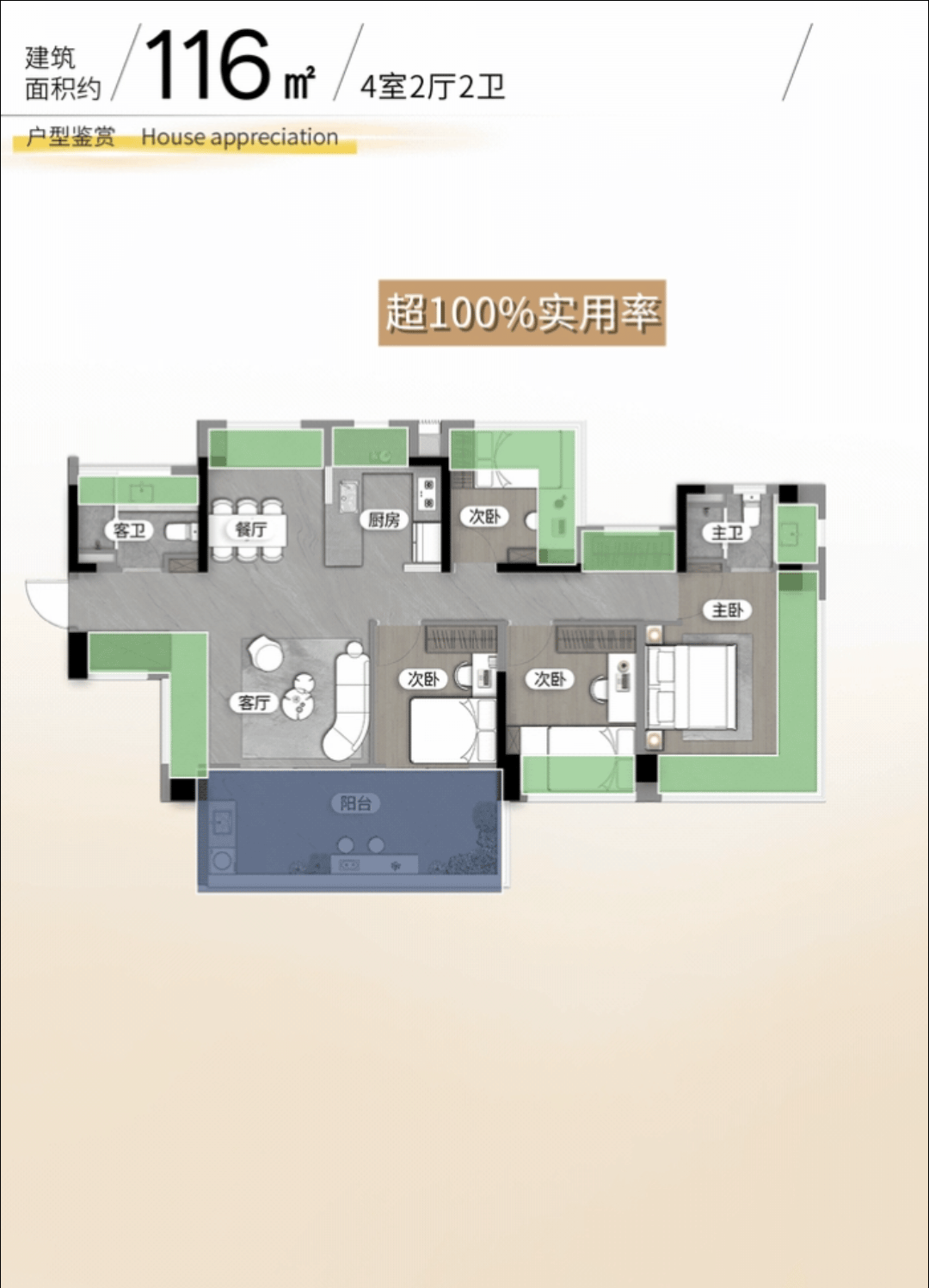 约116㎡实现超100%实用率,四开间朝南,约16米面宽远超进深,阳光清风自在流淌。客厅最大可做约7.25米横厅,X空间随需定制。南向约6.45米巨幕阳台贯通客厅与次卧,主卧约20㎡酒店式套卧,270°巨幕视野揽尽城央盛景。