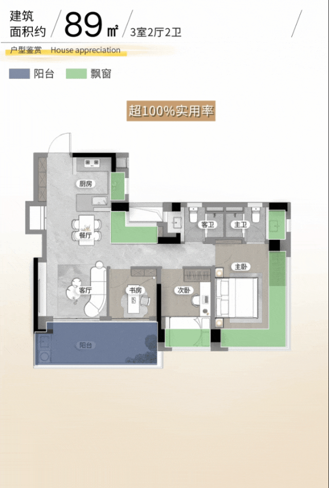 约89㎡却做到了市面罕见的四面宽朝南,约5.7米宽阳台连通客厅与书房,主卧270°环幕视野,极致采光与开阔视野令人赞叹,即使是入门级,也绝不将就。