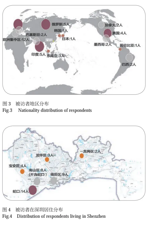 此次研究的被访者来源于世界各地,以欧洲和亚洲国家居多(图3),男女比例7:3,被访者来深圳的主要目的为工作,除此之外还有学习、婚姻以及其他原因;从事的职业类型丰富且具有较强专业性,如建筑师、教师、足球教练、IT技术人员等;来深圳之后的居住地分布在各个区,其中南山和福田较多(图4)。