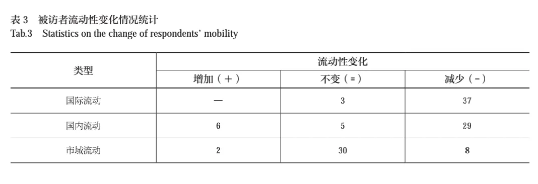 在40名被访者中,37名被访者表示新冠疫情后完全切断了国际流动。对于国内流动:29人表示减少了出行的频率;6表示增加了出行的频率;其余表示无影响。而对于市域流动:8人表示减少了在深圳的出行流动;2人表示疫情后反而增加了深圳的在地流动性,其余表示基本无影响(表3)。文章中对被访者按照性别进行分组编号,编号由性别及序号构成。其中,F(Female)代表女性,M(Male)代表男性,按照采访顺序生成序号。例如,“M19”表示第19位男性被访者。