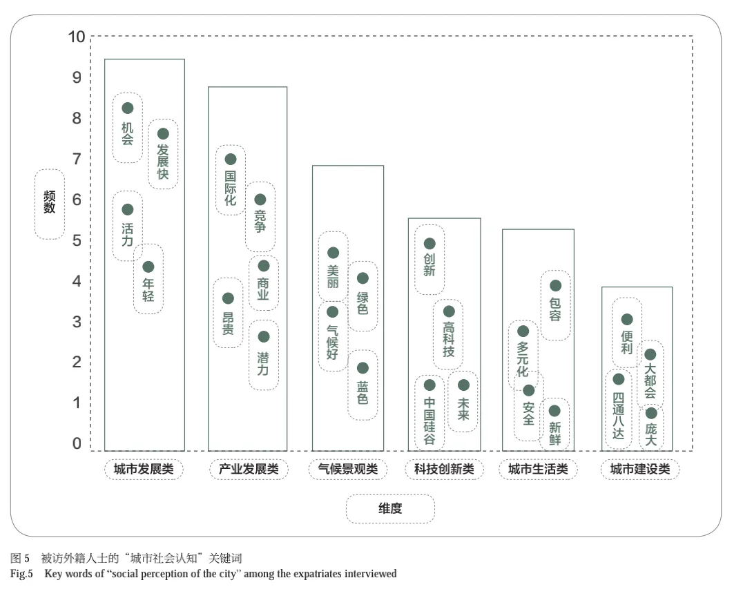 留在深圳的外国人对深圳的社会认同相对正向。这部分主要涉及被访者对深圳城市印象的描述。“城市印象”是个人对城市局部产生的印象和认知,通过对具有鲜明的识别性和表意性的城市局部元素归纳升华出一种被社会多数人所接受的“城市形象”。对访谈中“您如何用一些关键词来描述深圳?”这一问题的回答进行归纳分析,总结出六大类被访者对深圳的城市社会认知(图5)。统计发现,被访者对深圳的印象关键词集中在城市发展类和产业发展类,这一点符合前文提到的大多数被访者来深圳目的是工作。