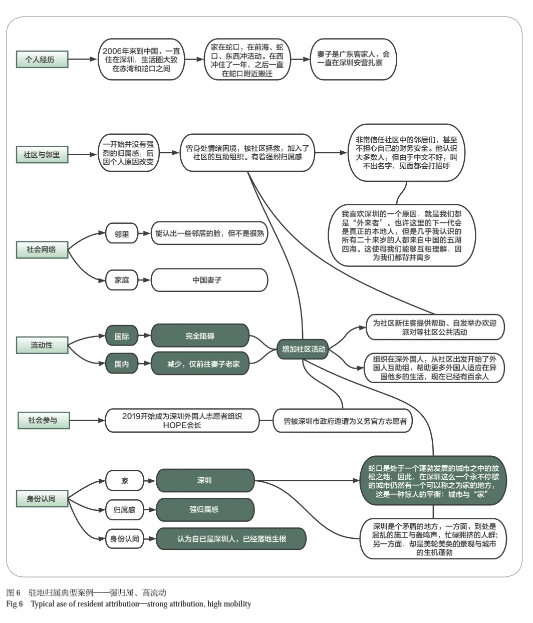 对于驻地归属群体而言(表6),由于家庭纽带、在地时间等因素已经形成落地生根的强归属感,其文化认同与行为模式已经接近于本地居民,在身份认同方面也多以“深圳人”自居。研究中驻地归属类较多居住在蛇口附近,来深圳时长较长,平均年限达到10年以上,从事的职业也各不相同。这类群体在疫情后全球流动性降低,在地流动性保持不变或有所增加,总体而言,呈现出高流动的特征。然而也有个别被访者考虑安全因素而降低流动性,但由于这一群体的地方认同与归属感来自其在地居住的经历,因此对于出行频率减少的被访者,也仍会通过其他方式增加在地社会联系,如社会参与等。所以疫情后流动性的变化对其地方感没有影响(图6)。