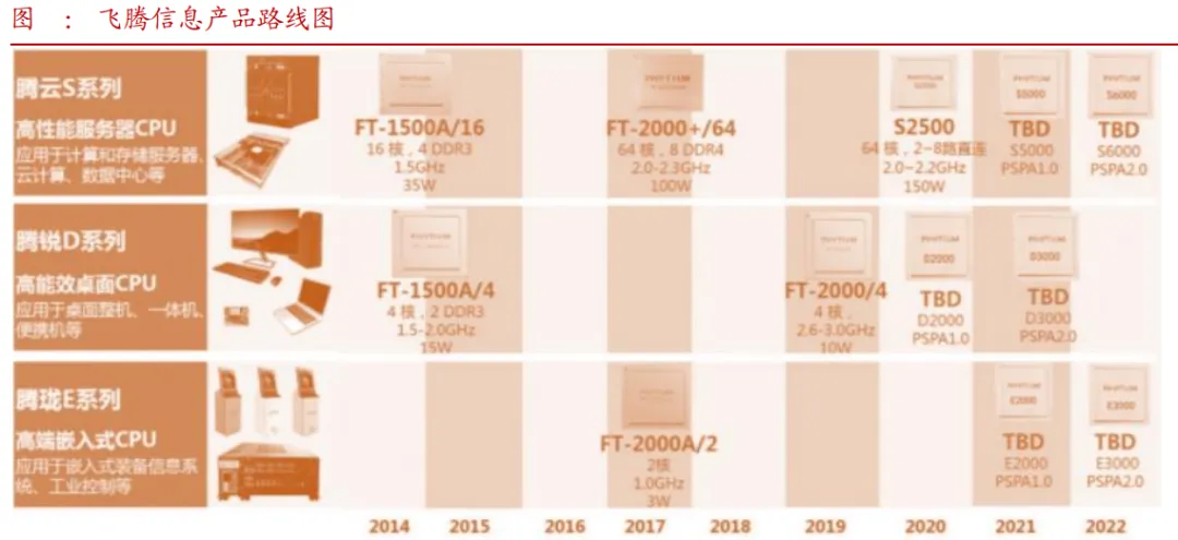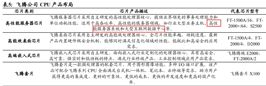飞腾CPU产品全面,其中飞腾腾云S系列,可用于大型数据中心高性能服务器,在政务、金融、电信、电力、能源等领域累计销售超1000万片,处于领先位置。