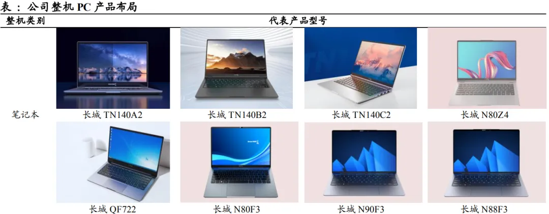 目前,中国长城实现完全自主设计、自主制造,形成国内整机产品谱系最全、实力最强自主产品线,如笔记本长城TN140A2、长城N90F3,台式机世恒TD200A2,一体机TA238C2等。