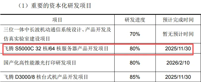 同时,公司基于飞腾S5000C的32核/64核服务器,研发进展顺利,预计在2025年11月底完成。