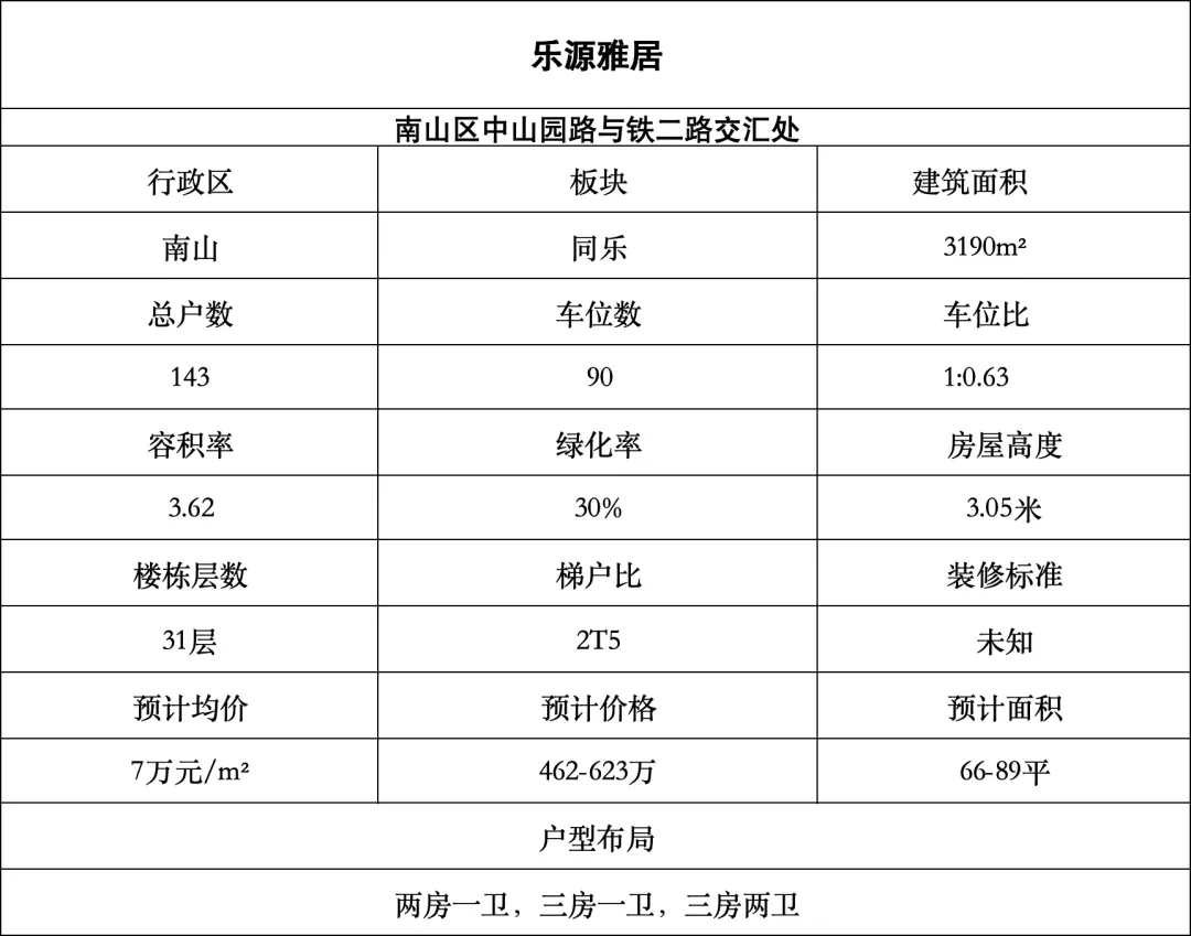 南山区同乐板块【乐源雅居】,面积66-76-83-89㎡2-4房,共102套。最大的亮点是户型,76㎡就能做到3房,89㎡可以做4房。项目位于荔源雅苑北面,100米高层单体楼,层高3.05米,2T5户。建设用地3190㎡,计容面积16600㎡,住宅户数143户,可售102户,总高31层,停车位90个。