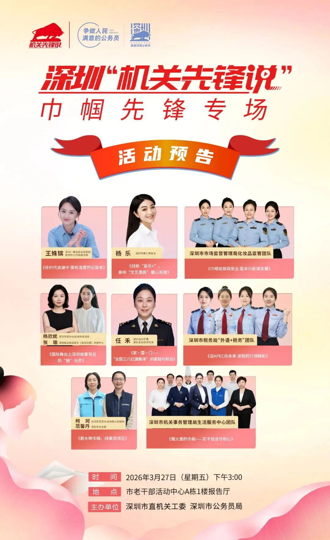 为进一步弘扬市直机关工委系统先锋模范精神,交流先进工作经验,激励各级党组织和党员干部锐意进取、担当有为、创先争优,为全市高质量发展做贡献,市直机关工委、市公务员局决定联合举办2026年深圳“机关先锋说”巾帼先锋专场活动,敬请关注!