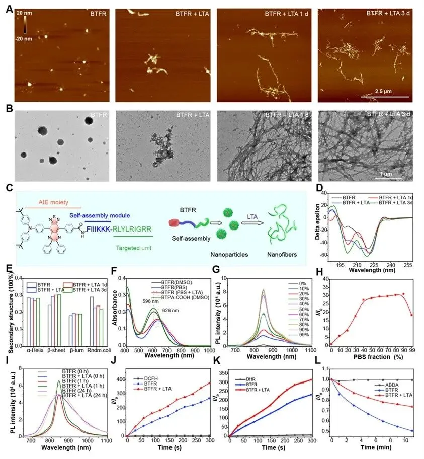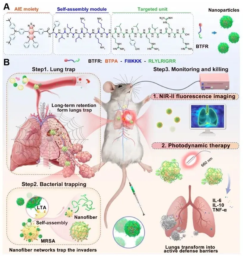 近日,一项发表于Journal of the American Chemical Society的研究提出了革命性的“肺捕获”治疗诊断新策略。该研究由深圳大学王东团队主导,不同于传统的纳米颗粒肺部递送或滞留策略,也不同于直接在血管中捕获细菌,该策略利用一种物理捕获系统,将循环中的细菌聚集并截留于肺部微血管网络中,从而通过局部光疗实现清除,并将肺部转化为一个主动防御屏障。基于这一理念,构建了一种近红外二区聚集诱导发光(AIE)-多肽生物偶联体系BTFR。BTFR由三个功能模块组成:第一,配体肽RLYLRIGRR,可选择性识别并结合革兰氏阳性菌(如MRSA)细胞壁上的脂磷壁酸(LTA);第二,自组装抗菌肽基序FIIIKKK,使BTFR在初始状态下形成纳米颗粒结构,并在与LTA结合后发生结构转变形成纳米纤维;第三,近红外二区AIE分子BTPA-COOH,用于实现实时荧光成像和光动力治疗。