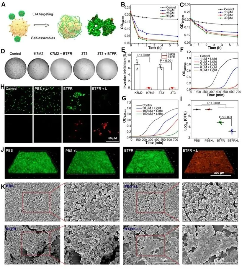实验表明,BTFR纳米颗粒能特异性识别金黄色葡萄球菌表面的靶点,并在结合后迅速自我组装成一张致密的“纳米纤维网”,将细菌牢牢缠绕、聚集,使其无法自由移动。更关键的是,这种“困住”策略直接瓦解了细菌的侵袭能力。单纯的捕获并非终点。BTFR被设计为“多模态”智能分子,其第二步杀招是“光动力清除”。研究证实,BTFR本身在黑暗条件下不具有直接杀菌活性,一旦对捕获了细菌的BTFR进行特定波长(660 nm)的光照,其内置的光敏模块会被激活,高效产生具有杀伤力的活性氧(ROS),对已聚集的细菌进行“定点清除”。BTFR联合光照,不仅能有效抑制新生物膜的形成,更能强力清除已成熟的生物膜。