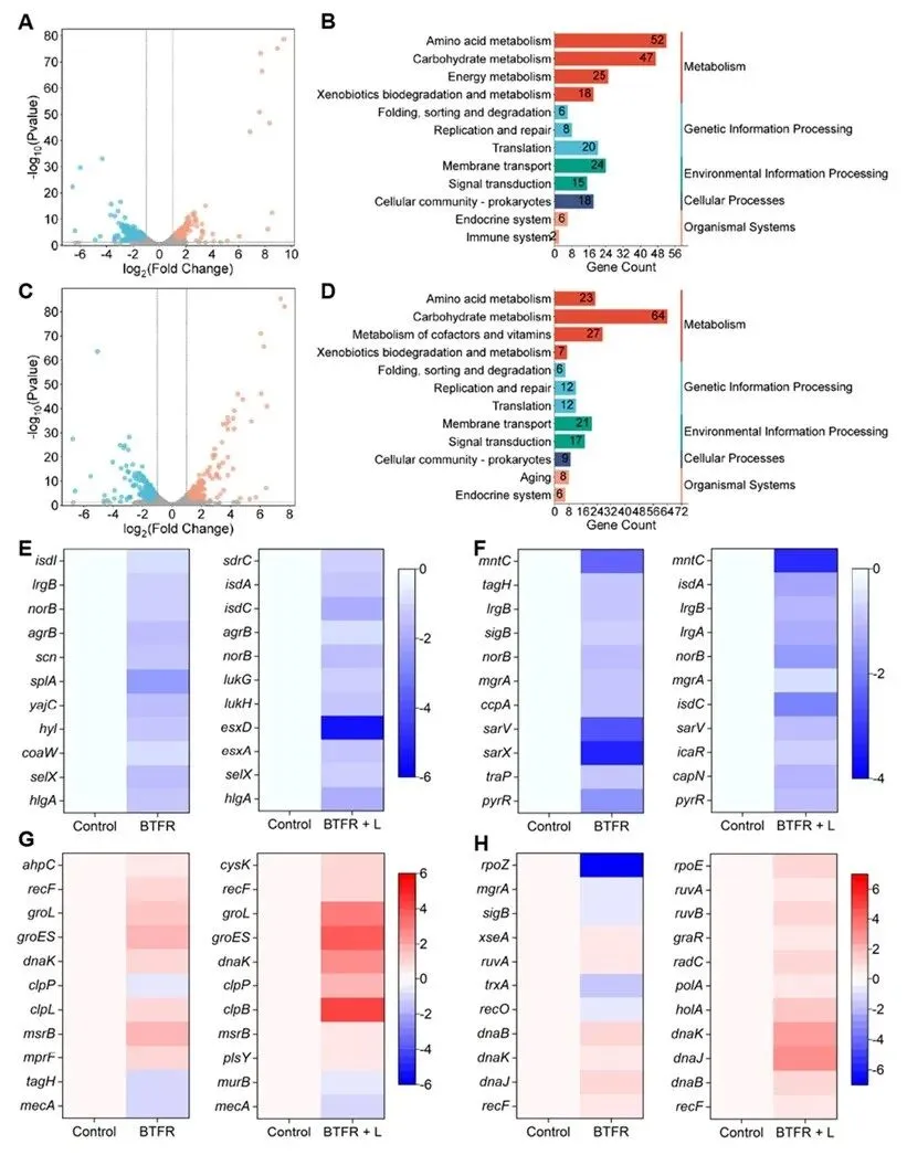 通过对比未处理的细菌,研究绘制了耐药菌在遭遇新型疗法时的全局基因表达变化图谱。分析显示,仅BTFR处理就影响了超过460个基因的表达。而当BTFR结合光照后,另有438个基因的表达发生显著改变。这些发生变化的基因广泛富集于多个关键生命过程,包括细胞间通讯、物质转运、DNA复制修复以及新陈代谢等,表明BTFR处理对细菌的生存状态造成了全方位冲击。该转录组学研究从最根本的基因表达层面,揭示了“物理捕获”与“生化清除”并非独立环节,而是连贯的协同作战。BTFR首先创造一个物理限制的微环境,迫使细菌转入低毒、低侵袭的防御状态;紧随其后的光动力打击,则能高效地对此状态下聚集的细菌造成致命DNA损伤。