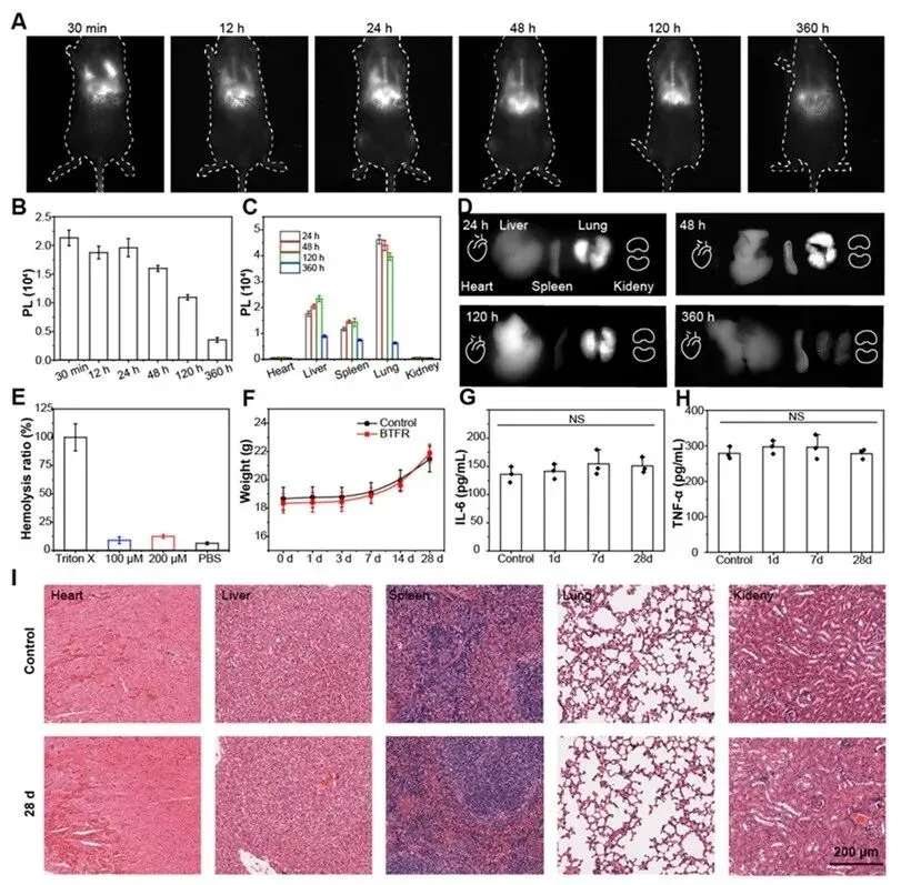 静脉注射后,BTFR迅速在肺部聚集,产生强烈的荧光信号,证实了其高效、选择性的肺部靶向能力。BTFR在肺部的驻留是一个智能的动态过程。其荧光信号在注射初期达到峰值,随后逐渐减弱,并在约15天后基本无法检测。药代动力学分析揭示了背后的精妙机制:BTFR并非被一次性永久截留,而是在肺部毛细血管中经历“捕获-解离-再捕获”的循环。在血流剪切力作用下,部分聚集体可分解并重新进入体循环,而分子本身的肽链会逐渐被蛋白酶降解。最终,降解产物主要通过肝脏被代谢清除,平均终末消除半衰期约为107.7小时。